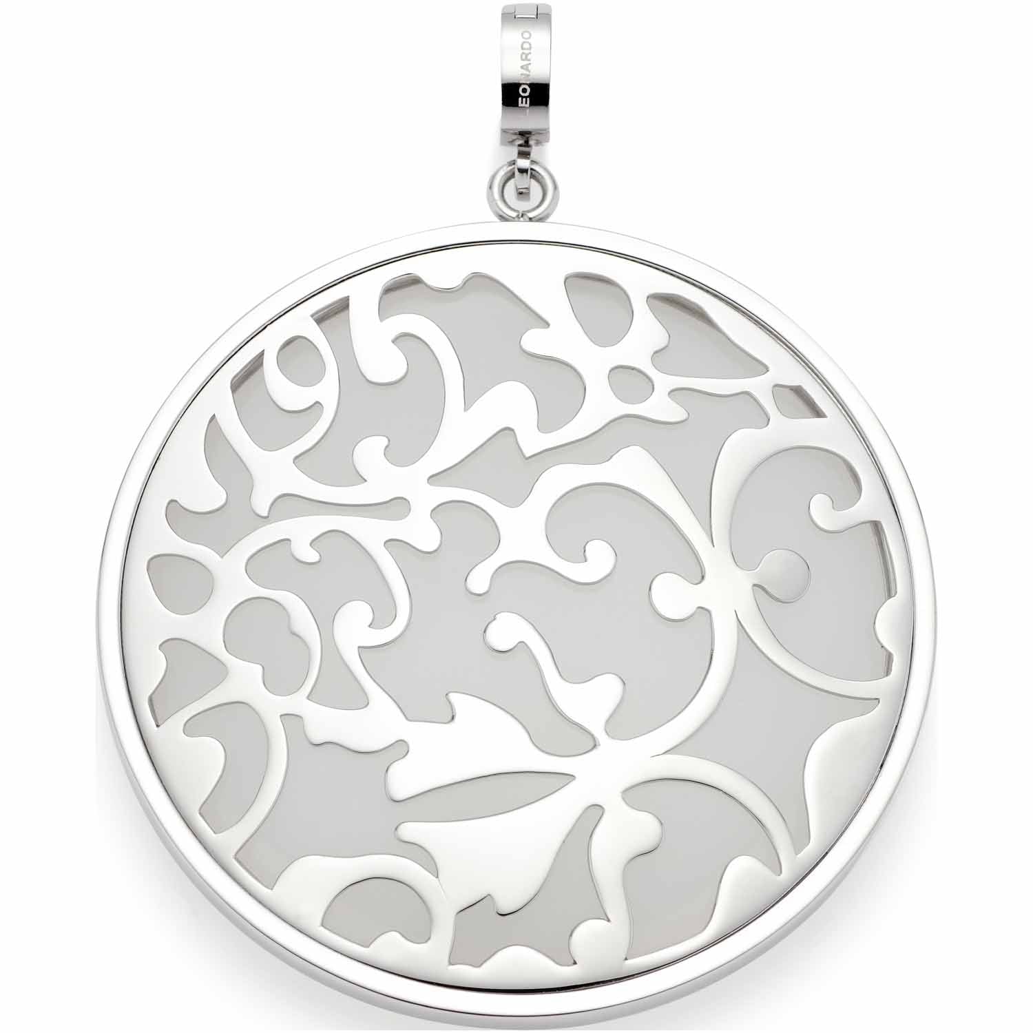 Die Front des großen runden Anhängers ziert ein durchbrochenes ornamentales Muster. Durch dieses Muster schimmert ein opaker weißer Glasstein hindurch. Glänzender Edelstahl und weißer Glasstein fügen sich perfekt zu einem eleganten Hingucker zusammen. An langen und kurzen Halsketten der Clip&Mix-Serie ist der Charm bestens aufgehoben.