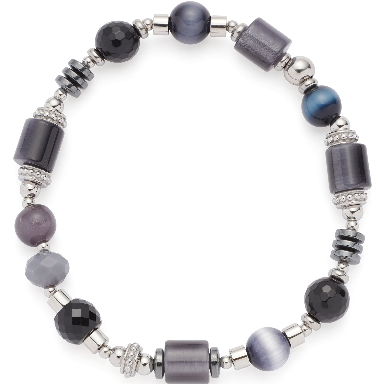 Dieses Armband spielt mit einem schönen Mix aus unterschiedlichen Perlen diverser Formen. Zylinder, Ellipsen, Oliven aus Glas, Catseye und Hämatit wechseln sich stilvoll ab. Dazwischen finden sich kleine Kugeln aus Edelstahl. Farben von Hellgrau bis Schwarz machen den zeitlosen Look perfekt. Dank des elastischen Bands lässt sich das Armband einfach über die Hand streifen.
