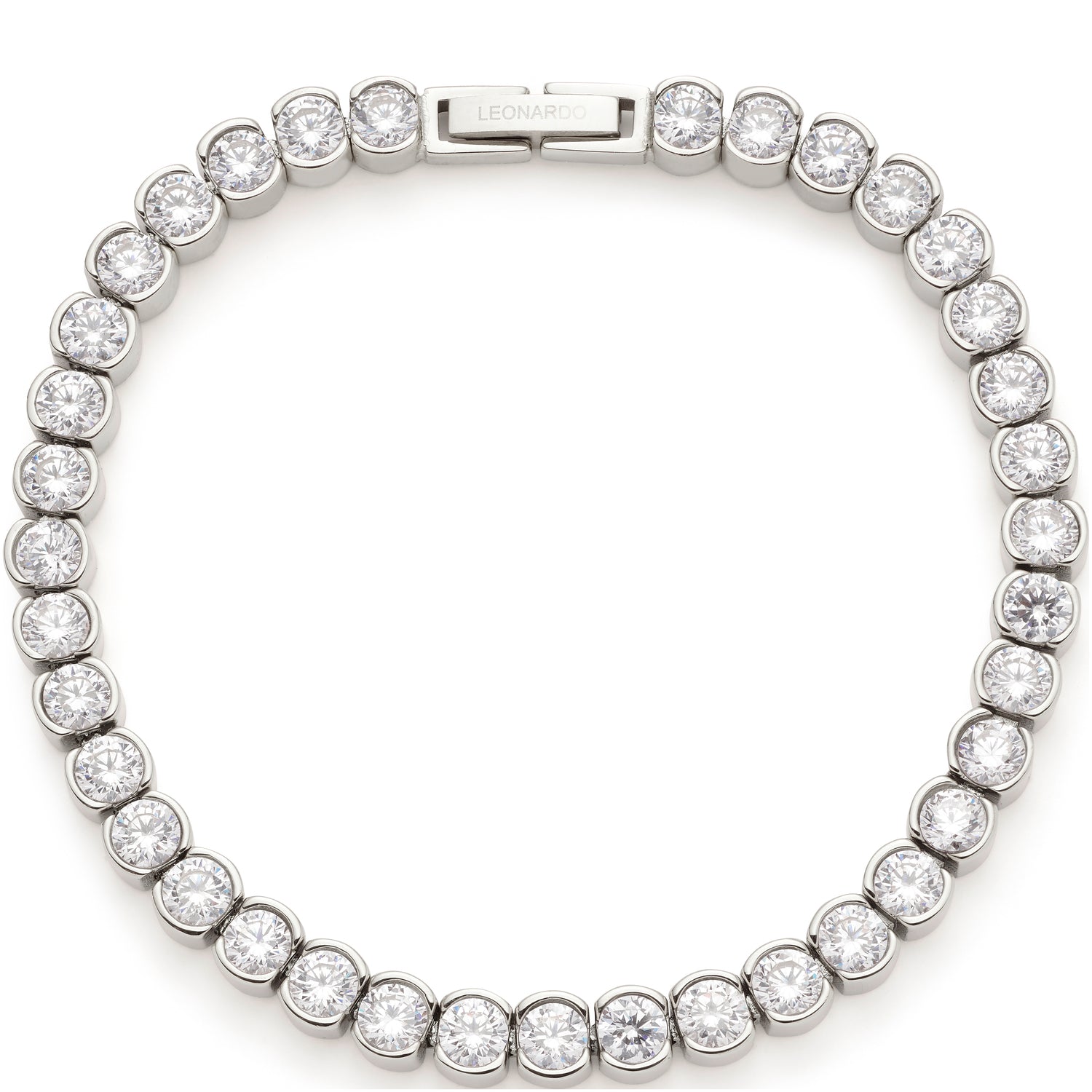 Klassisch mit funkelndem Finish - damit begeistert dieses Modell. In dem klassischen Tennisarmband reihen sich weiße, runde Zirkonia Steine aneinander. Die Fassungen sind jeweils seitlich am Übergang zum nächsten Stein durchbrochen. Mit einem Klickverschluss lässt sich das Armband leicht und sicher anbringen. Ob zum puristischen Chino-Look oder elegant zum Etuikleid - das fein glitzernde Armband setzt edle Akzente.