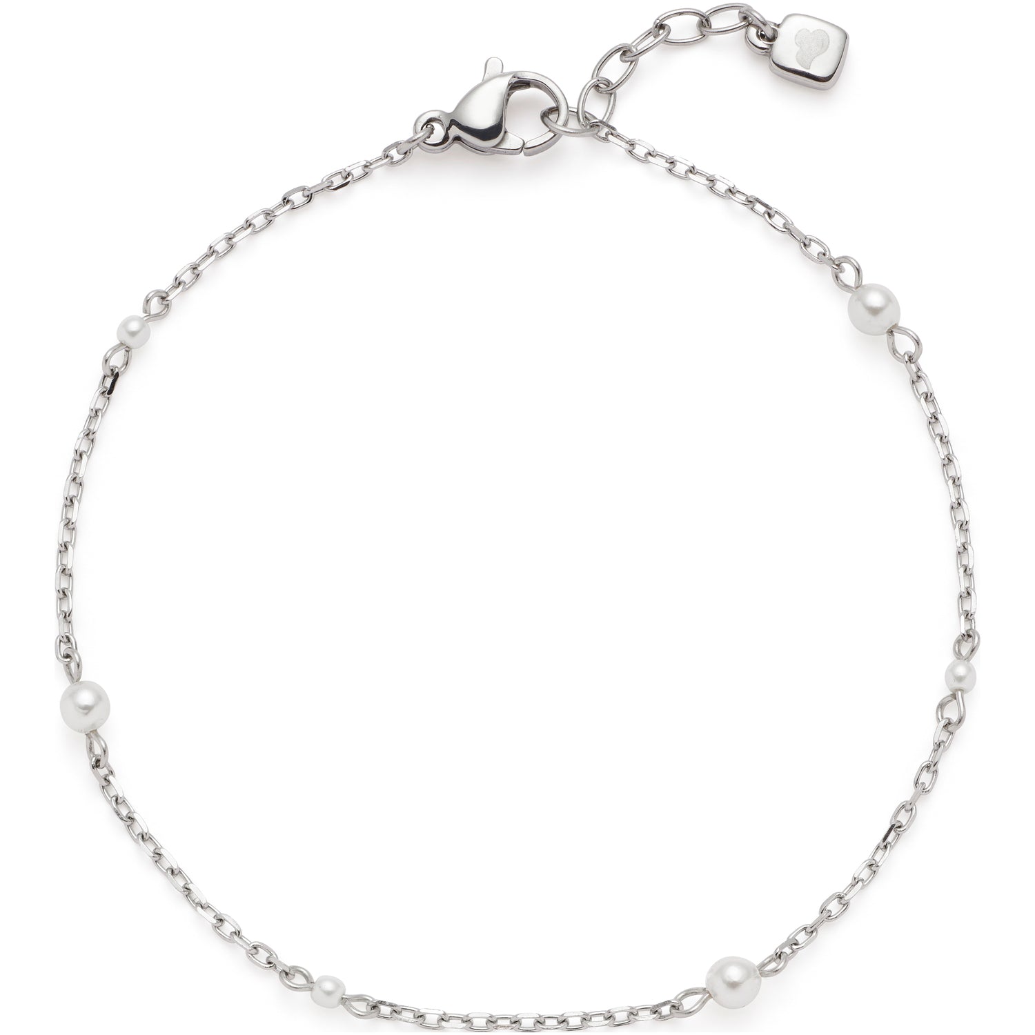 Passend zur Kette Navina zeigt sich auch das Armband im filigranen Design. Der klassische Perlen-Look wird hier auf moderne Weise interpretiert. Weiße Imitationsperlen in zwei unterschiedlichen Größen wechseln sich in gleichen Abständen ab. Das Armband legt sich ganz zart um das Handgelenk und lässt sich dank des Karabinerverschlusses und der Verlängerung variabel verstellen.