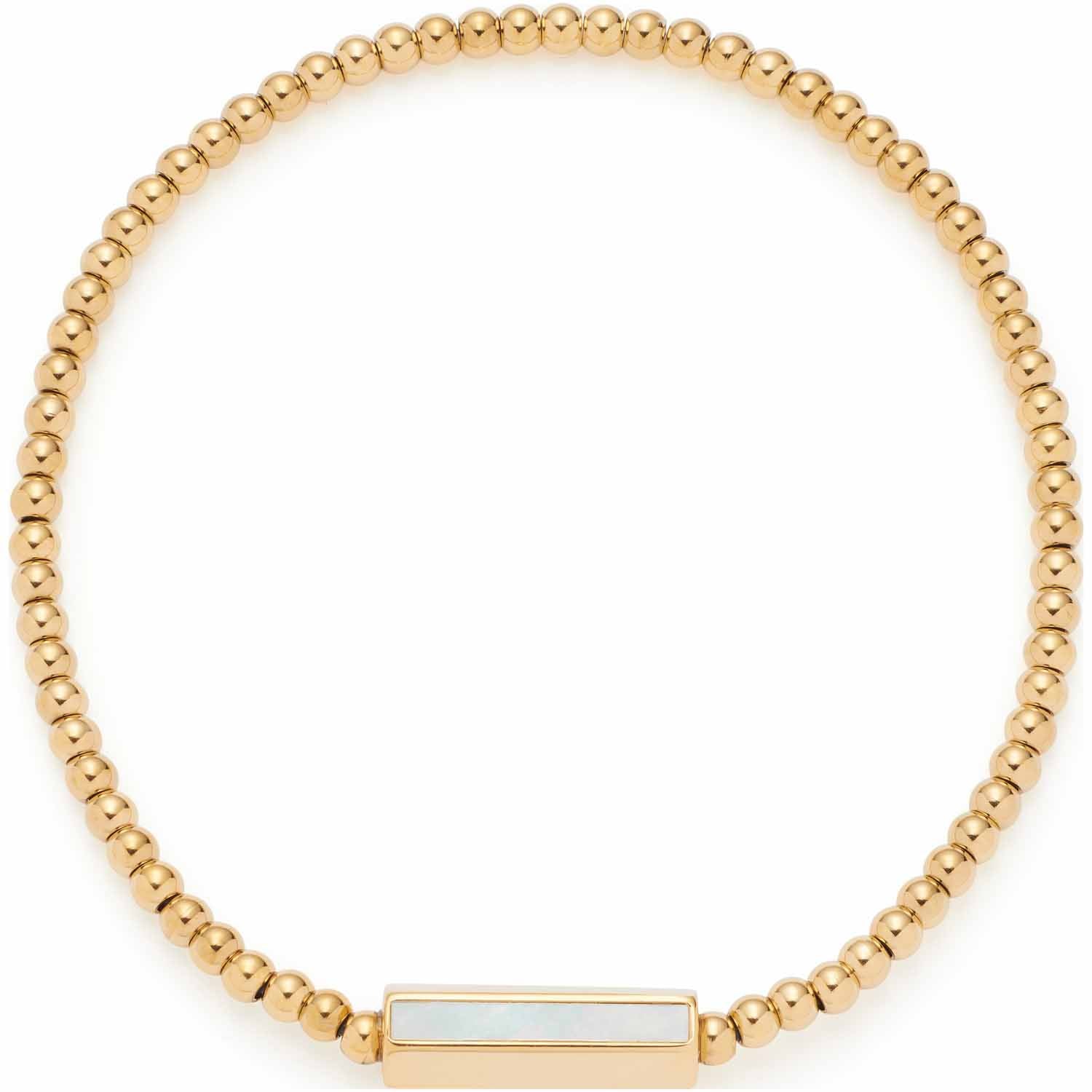 Das moderne Armband besteht aus aneinandergereihten, runden Edelstahl-Perlen und einer Zylinder-Perle im Hexagon-Profil. Diese ist auf zwei Seiten mit weißem Perlmutt verziert, während die anderen Seiten auf eine individuelle Gravur warten. Ein schimmerndes Kunstwerk, das Ästhetik und Persönlichkeit vereint. Das Armband ist elastisch und lässt sich dadurch leicht über die Hand streifen.