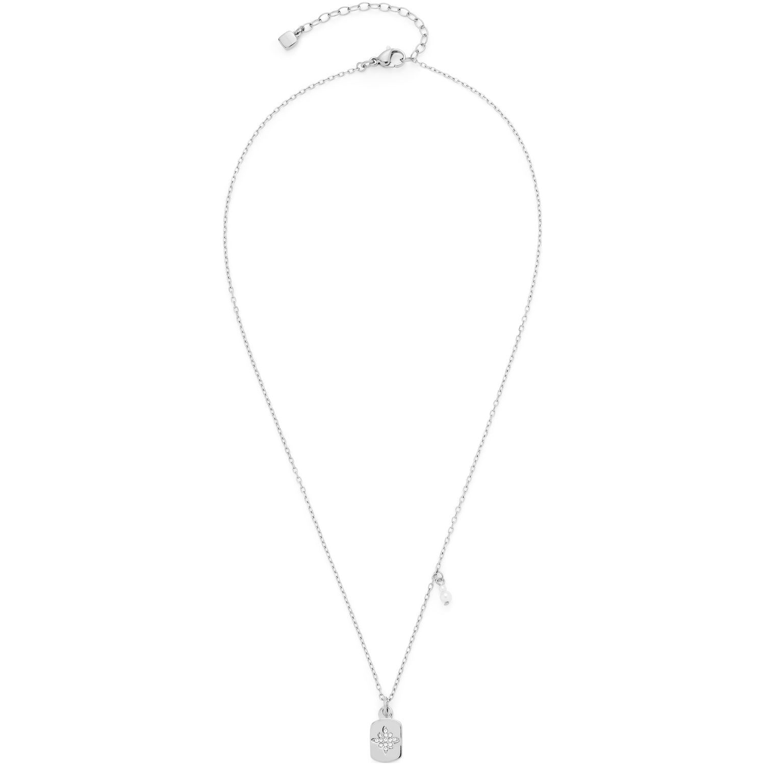 Die kurze Ankerkette aus Edelstahl macht sich schön in angesagten Layering-Looks, überzeugt aber auch solo getragen. Den Mittelpunkt spielt ein weich geformter, rechteckiger Anhänger. Kleine Zirkonia Steinchen in Form eines Sternes bringen den Anhänger zum Funkeln. Zusätzlich sind in der Kette zwei übereinander angeordnete Perlen eingehängt und bilden einen charmanten Kontrast. Mit der Verlängerungskette kann die Länge individuell angepasst werden.