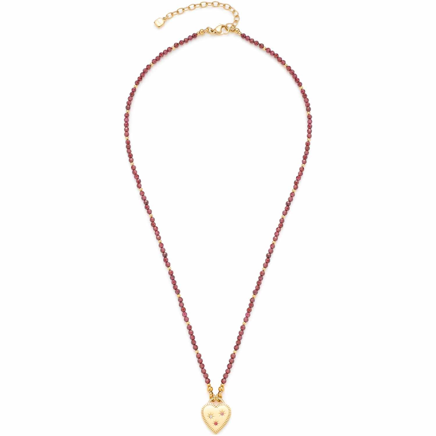 Die besondere Leuchtkraft der natürlichen Granat-Perlen mit funkelndem Facettenschliff steht im Mittelpunkt dieses feinen Colliers. Neben den aufgereihten Granat-Perlen, die von Mini-Edelstahl-Kügelchen durchsetzt sind, hält die kurze Halskette für ihre Trägerin noch einen flächigen Herz-Anhänger mit fein ziseliertem Rand und winzig kleinen Glaskristallen in klarem Farbton, Pink und Granatrot bereit. Durch die feine Strahlen-Prägung wirken die facettierten Glaskristalle wie weit entfernte, funkelnde Sterne.