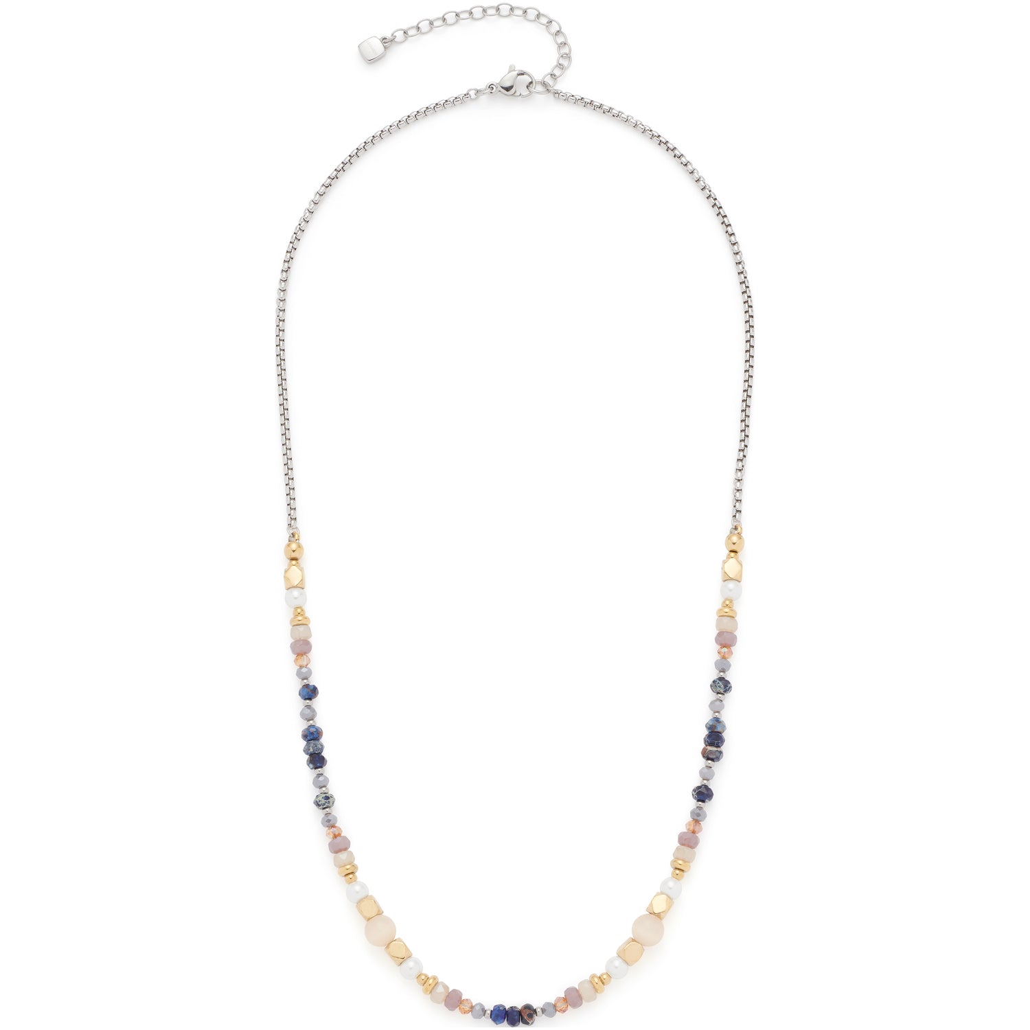 Harmonische Farbkomposition, zeitloses Design und edle Materialien: Diese Kette verschönert einfach jeden Look. Die kurze Kette zeigt sich mit verschiedenen Perlen in Blau, Beige, Creme und Weiß. Im Kontrast dazu hat die Venizianerkette ein Mittelstück aus gereihten Halbedelsteinperlen (Sodalith), Perlmutt- und Glasperlen. Abgerundet wird der stilvolle Mix mit weißen Imitationsperlen und goldenen, facettierten Würfelchen. Eine dezente Optik, die gerade deshalb so besonders wirkt und schön zu allen Cashmere-Looks passt. Der Karabinerverschluss und die Verlängerungskette sind zudem ein praktisches Detail.