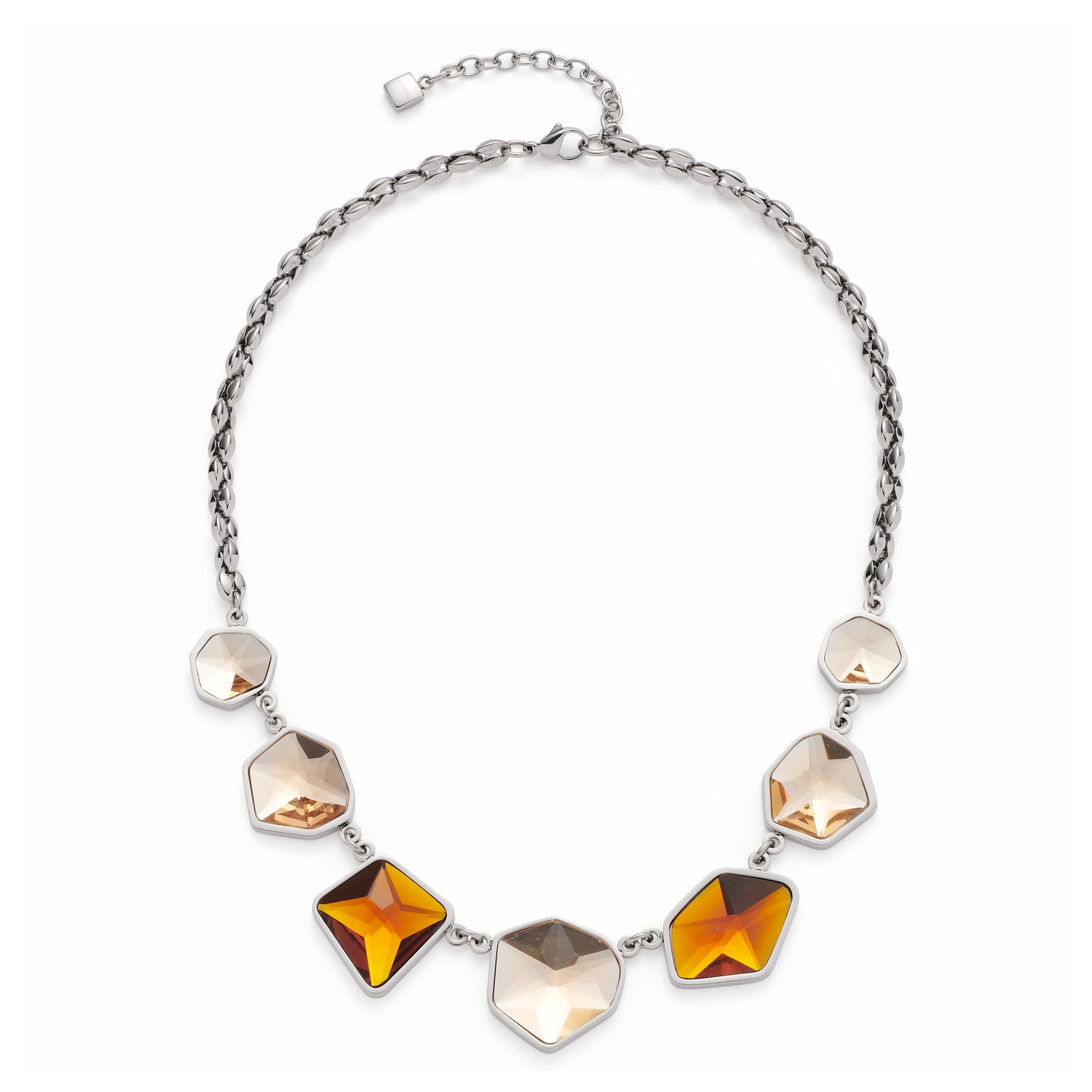 Mit Ecken und Kanten! Dieses Collier weiß seine Trägerin in den Mittelpunkt zu setzen. Plakativ geformte Glaskristalle in Brauntönen, die wie aus der Rohform herausgebrochen sind, heben sich mit natürlicher Schönheit und Extravaganz hervor. Das opulente Statement der Kristallglassteine wird von kräftigen Kettengliedern stilvoll unterstrichen.
