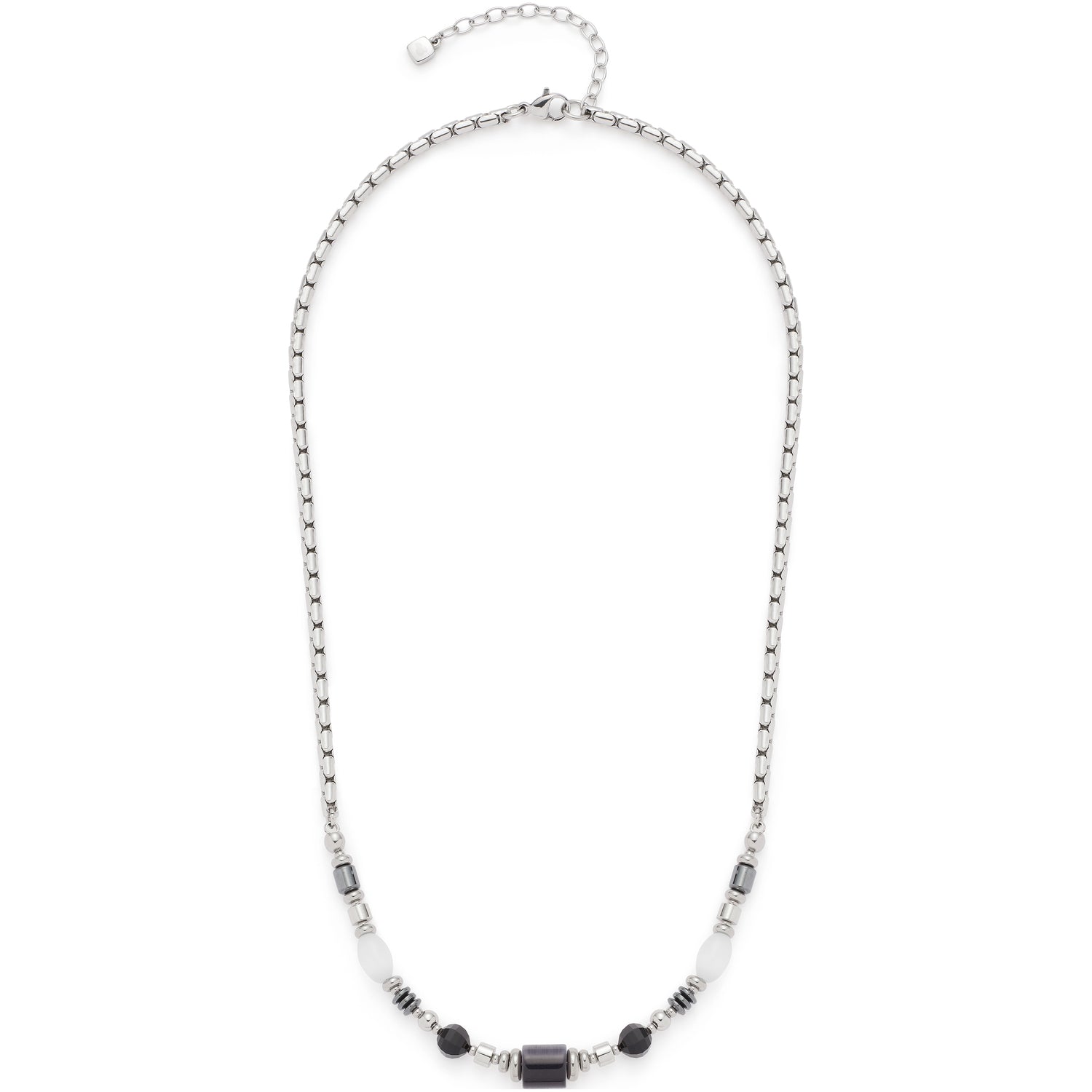Farben wie Hellgrau bis Schwarz prägen den zeitlosen Charakter dieser Kette. Die kurze Collier-Kette besteht aus einer Venezianerkette mit einem Mittelteil aus aneinander gereihten, verschiedenen Perlen. Formen und Farben wechseln sich dabei harmonisch ab. Eingesetzt sind Zylinder, kleine Ellipsen, olivenförmige und runde Perlen in Hellgrau bis Schwarz. Dazwischen befinden sich kleine Stahlkugeln aus poliertem Edelstahl. Damit folgt die Kette dem trendstarken Chunky-Stil auf schönste Weise. Dank des Karabinerverschlusses und Verlängerungskette passt sich die Kette bestens an.