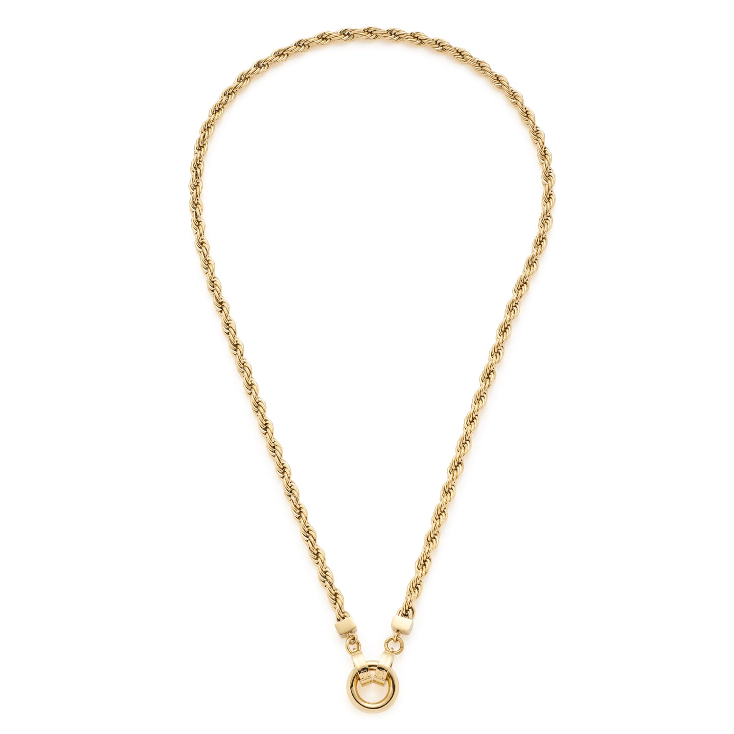 Kurze, kräftige Halskette aus golden ionenplattiertem Edelstahl. Die Dreifach-Ankerkette ist in sich verdreht und erhält so eine Kordel-Optik. Ein Eyecatcher, der sowohl solo, als auch von einem Anhänger an dem runden Edelstahlring begleitet, auf den verschiedensten Oberteilen stets imposant zur Geltung kommt.
