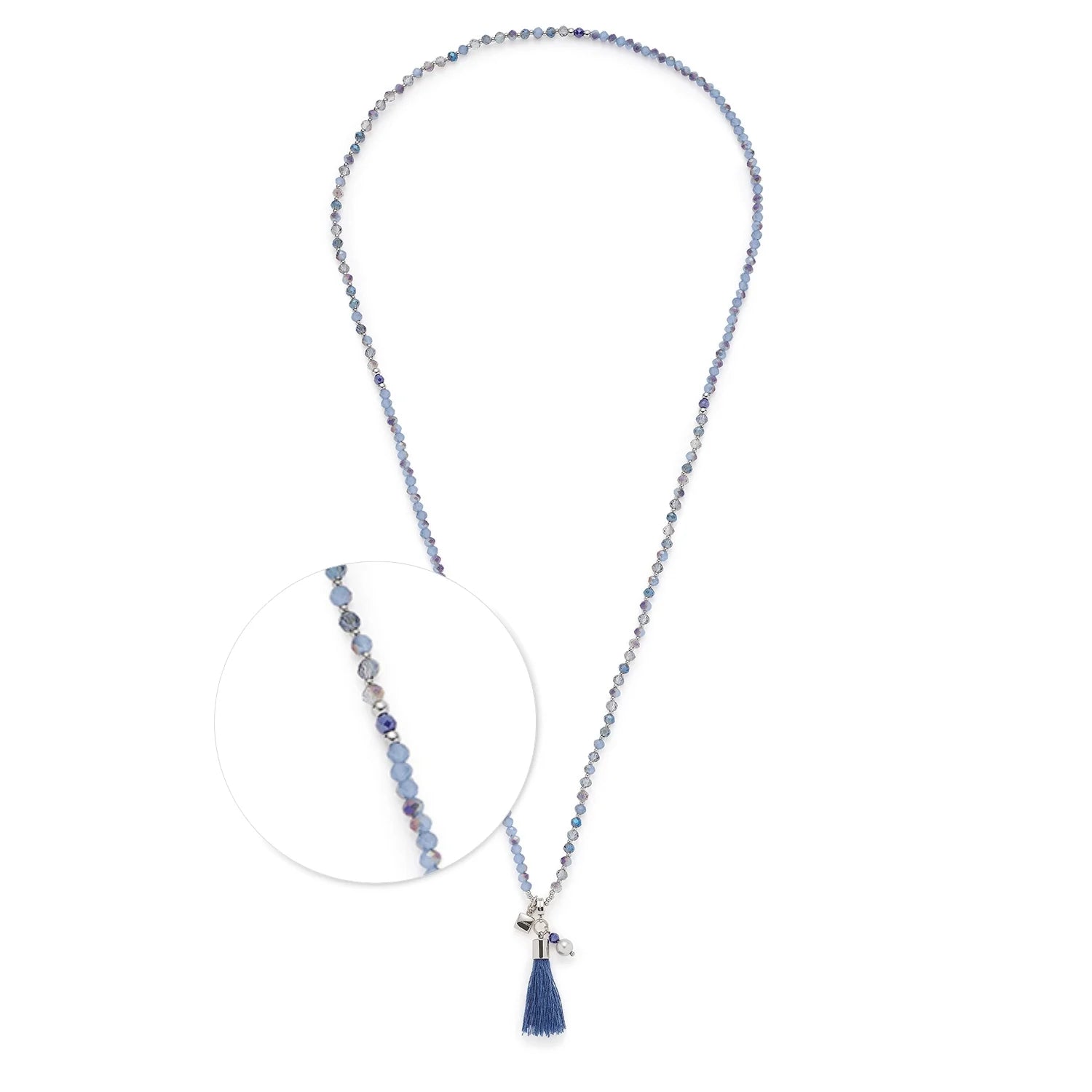 Lass dich von den coolen Blau- und Grautönen inspirieren und kombiniere diese Kette am besten zu ähnlich kühlen Farben oder lässigen Denim-Looks. Glasperlen und feine Silberkugeln werden hier gemixt und vereinen sowohl ein klassisches als auch modernes Design. Ein gekonnter Hingucker sind auch die filigranen Charms und eine abnehmbare Quaste. Die Kette begeistert aber vor allem auch mit ihrer Flexibilität. Dank des elastischen Bandes kannst du sie locker um den Hals tragen oder auch mehrmals um das Handgelenk wickeln.