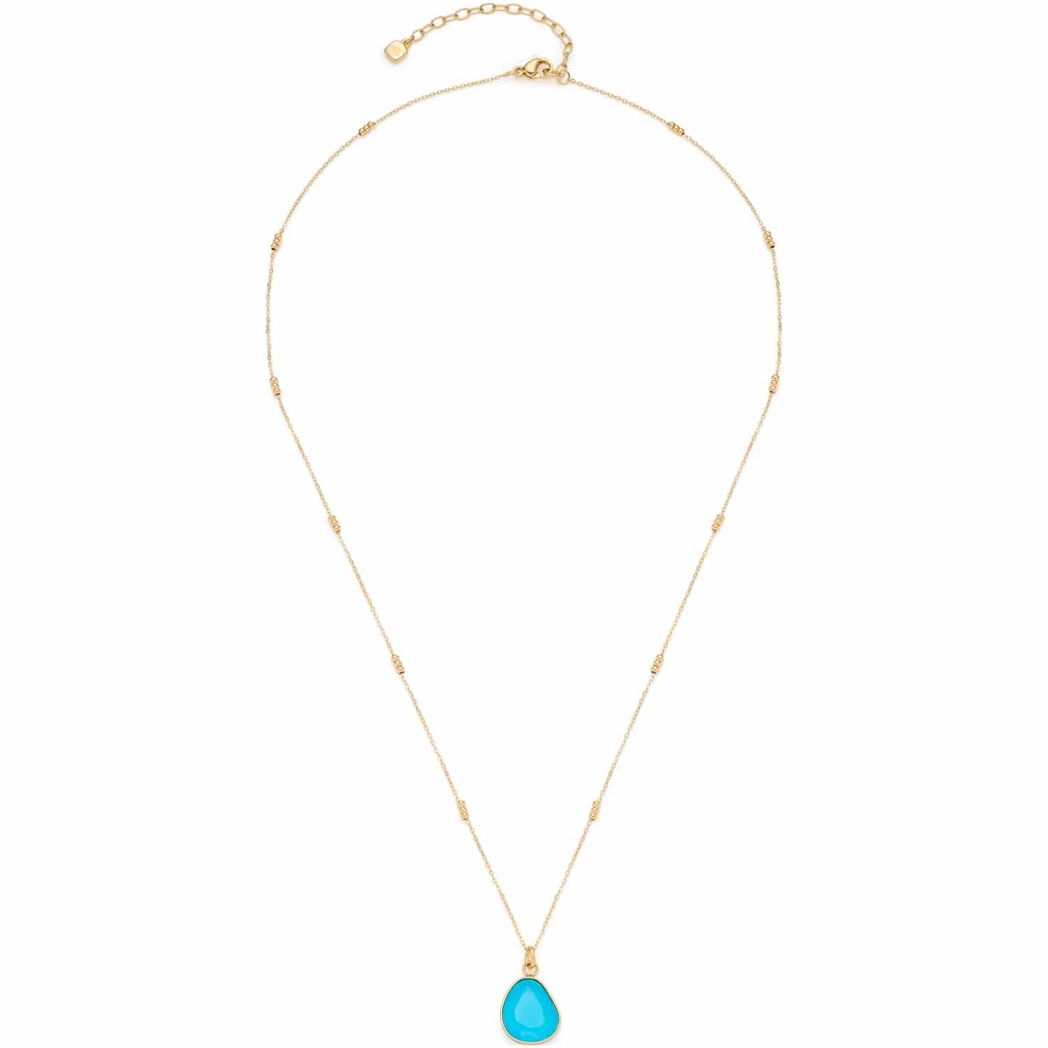 Diese mittellange und feine Spiegel-Ankerkette wird von eingesetzten Mini-Edelstahl-Kügelchen unterbrochen. Highlight der Halskette ist natürlich der organisch geformte, tropfenförmige Anhänger. Der offene Rahmen fasst einen facettierten opaken Glasstein in strahlendem Azur-Blau. Das ist Sommer-Feeling pur. Die Komposition mit goldener Ionenplattierung wirkt besonders schön.