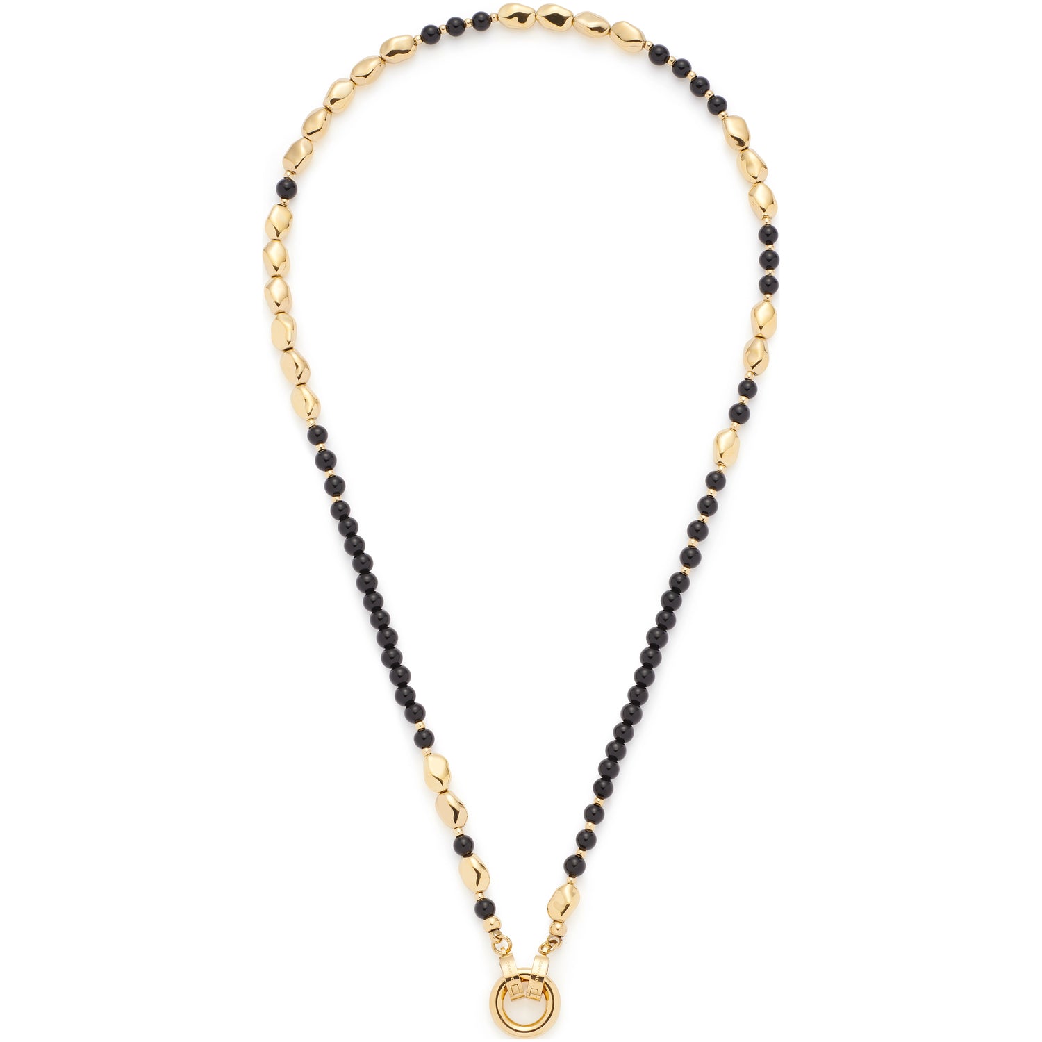 Die kurze Kette ist ein vielseitiges und klassisches Schmuckstück. Bei ihr reihen sich in unregelmäßigen Abständen Nugget förmige Goldperlen und schwarze Glasperlen aneinander. Goldene Mini-Edelstahlkugeln befinden sich noch dazwischen und vollenden das edle Design. Die beiden M-Clips und ein kleiner, runder Ring ermöglichen das Einclippen kleiner oder großer Anhänger aus der Clip&Mix-Serie. Auch eine Verlängerung der Kette mit dem passenden Armband ist möglich.
