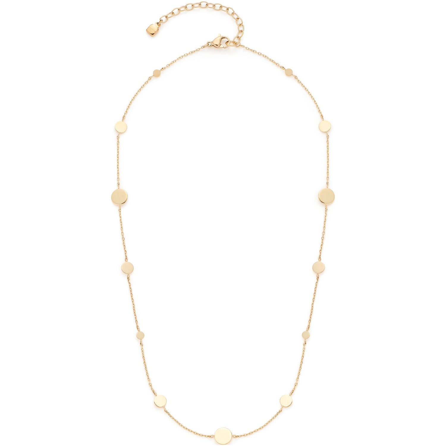 Ein zeitloses Schmuckstück, das viele Looks auf nonchalante und stilvolle Weise ergänzt. In die zarte, weite Vierkant-Ankerkette sind schlichte, runde Plättchen von unterschiedlicher Größe eigenhängt. Über den Karabinerverschluss mit Verlängerungskettchen lässt sich die feine Kette in ihrer Länge variieren. Minimalistische Ästhetik in seiner schönsten Form.