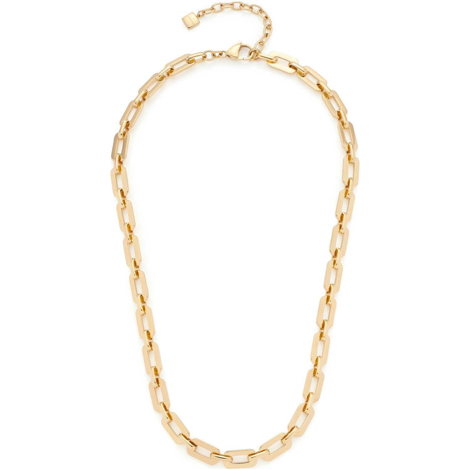 Für minimalistische Trend-Looks ist dieses Collier aus flächigen Kettengliedern eine wunderbare Bereicherung. Mit ihrer goldenen Ionenplattierung, der polierten Oberfläche und einer schlichten Formensprache setzt sich die Kette stilvoll ab. Vor allem in der Kombination mit klassischen Stylingpartnern wie einem Rollkragen fühlt sie sich wohl und wertet jedes Outfit optisch. Schließen lässt sich die Kette mit einem Karabinerverschluss und einer Verlängerungskette.