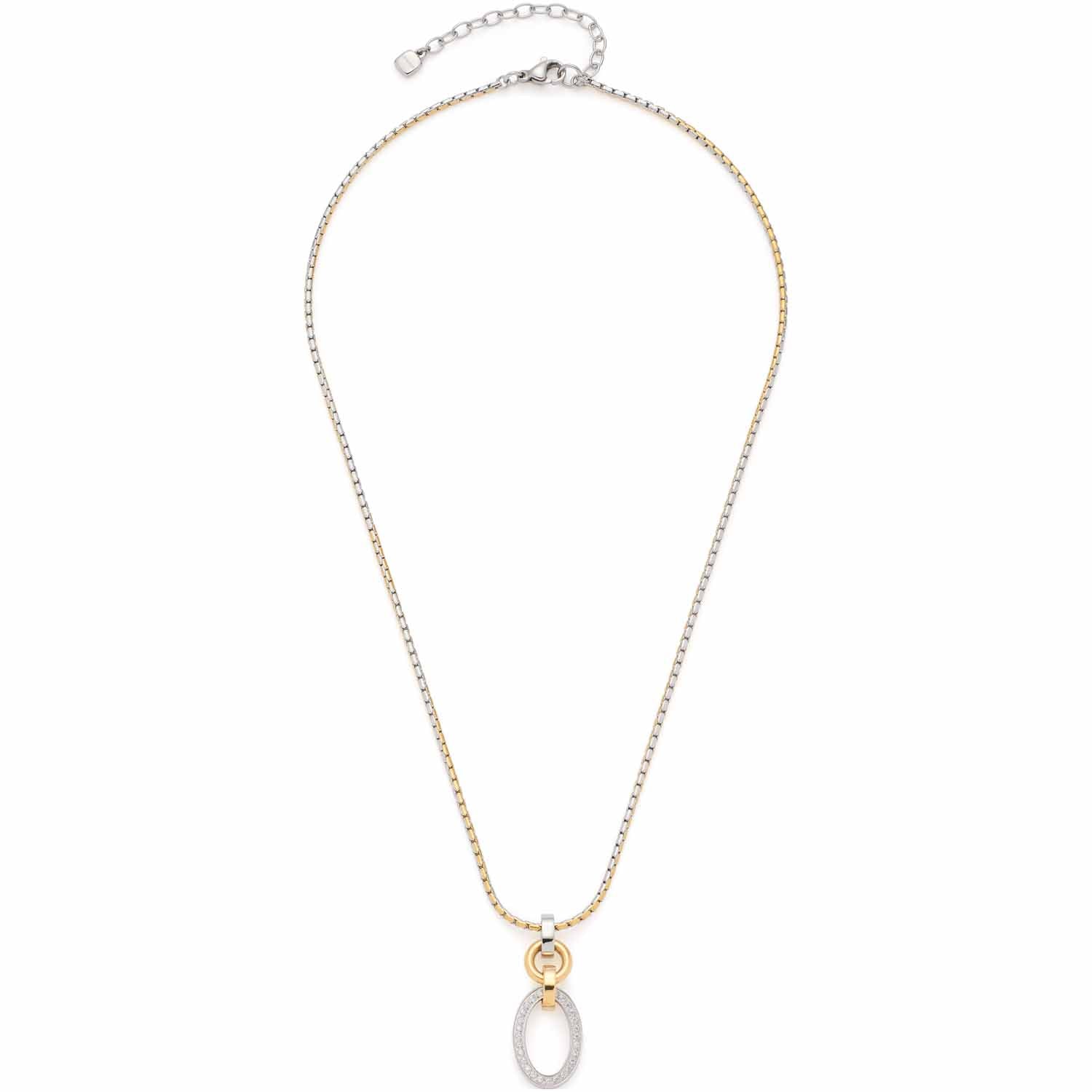Die Halskette setzt auf den aktuellen Trend massiv gearbeiteter Kettenglieder. Die Kette ist zweifarbig gestaltet ? eine Hälfte in glänzendem Edelstahl und die andere Hälfte mit goldener Ionenplattierung. Durch Bewegung und das Rollen der Kette am Hals entsteht ihr schöner Bicolor-Effekt. Verschieden große Kettenglied-Elemente ergeben in ihrer Zusammensetzung den Anhänger dieser Kette. Das große, ovale Schlusselement ist mit klaren, facettierten und gefassten Zirkonia-Steinchen besetzt und setzt das Dekolleté stilsicher in Szene.