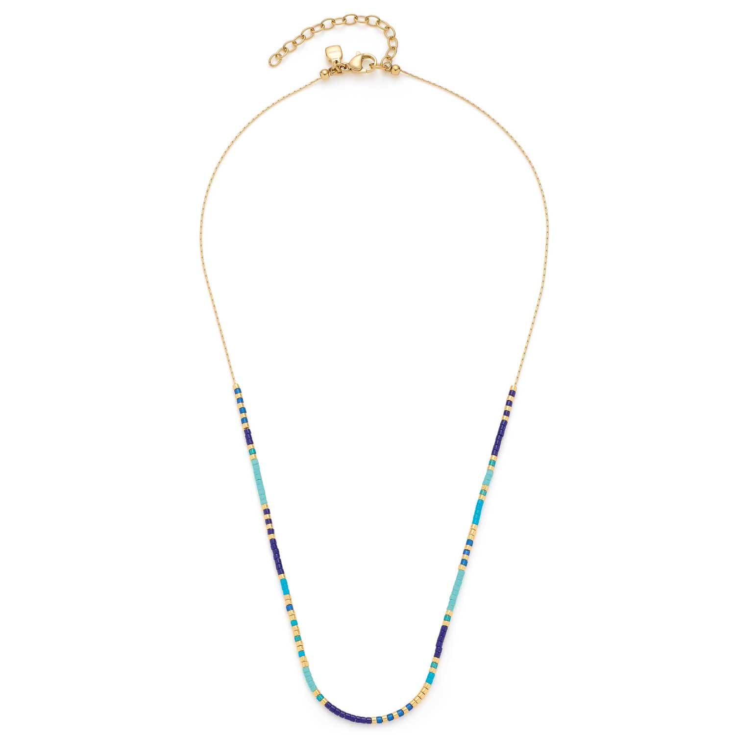 Miyuki Delica-Glasperlen in Dunkelblau, Türkis und Golden plattiert reihen sich in harmonischer Unregelmäßigkeit dich an dicht aneinander und ergeben so einen wunderschön grafischen Effekt. Das rund ausgeformte, zarte Ankerkettchen im hinteren Teil wird von Karabiner und Verlängerungskettchen geschlossen. Eine schicke Halskette mit Surfer-Attitüde!