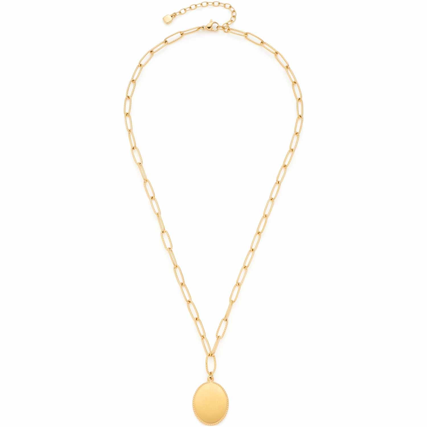 Die kurze Kette besteht aus modernen, fein kordierten Paperclip-Gliedern. Ein ovaler, flächiger Medaillon-Anhänger sorgt für eine kleine Y-Form und verleiht der Kette eine subtile Raffinesse. Der Anhänger selbst begeistert mit einem ziselierten äußeren Rand, der ihm eine zeitlose Eleganz verleiht. Die Vorderseite ist seidenmatt gebürstet, schafft eine weiche Optik und betont das kunstvolle Design. Die glatte Rückseite lässt sich mit einer persönlichen Gravur individualisieren.