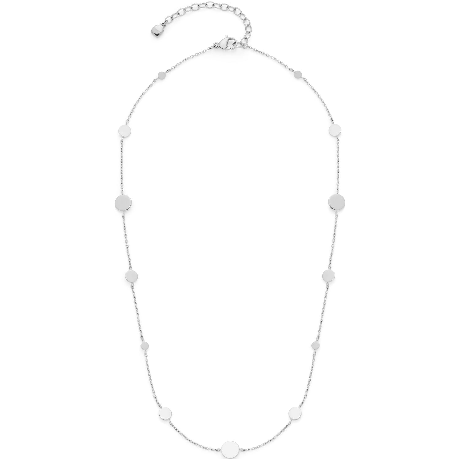 Ein zeitloses Schmuckstück, das viele Looks auf nonchalante und stilvolle Weise ergänzt. In die zarte, weite Vierkant-Ankerkette sind schlichte, runde Plättchen von unterschiedlicher Größe eigenhängt. Über den Karabinerverschluss mit Verlängerungskettchen lässt sich die feine Kette in ihrer Länge variieren. Minimalistische Ästhetik in seiner schönsten Form.