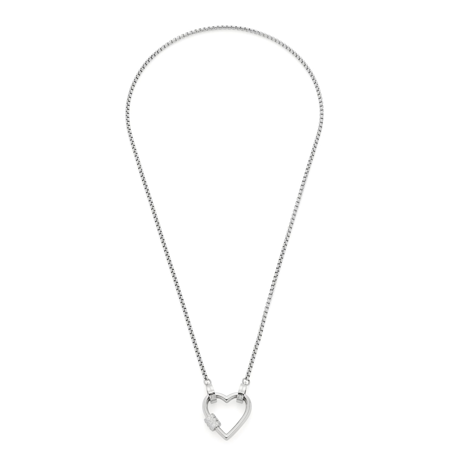 Das Trendpotenzial dieser kurzen Venezianer-Halskette ist nicht zu übersehen. In die zwei Clips ist ein feminin wirkender Karabiner in süßer Herzform eingehangen, dessen zylindrischer Drehverschluss mit gefassten Zirkoniasteinchen besetzt ist. Gelassene Weiblichkeit in ihrer schönsten Form.