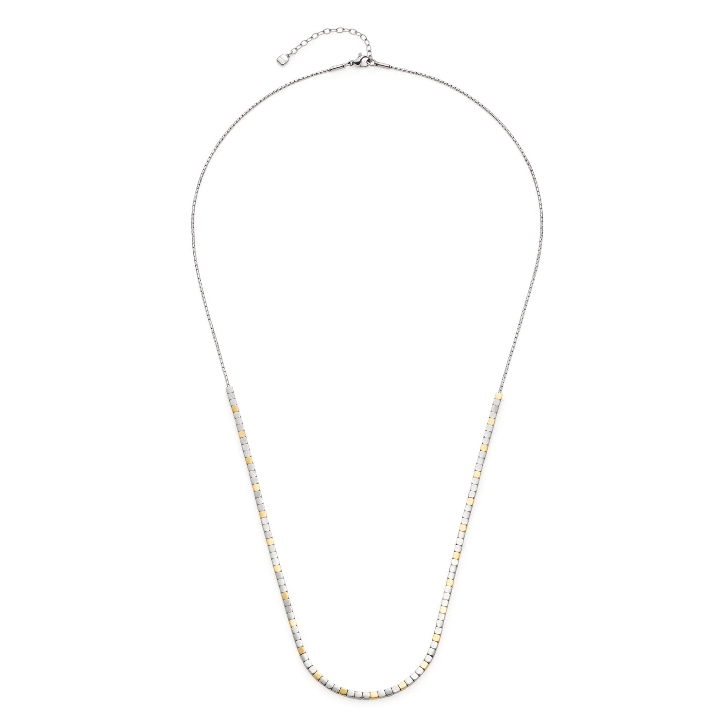 Purismus steht bei dieser langen Halskette im Fokus. Dafür setzt sich das klar gestaltete Schmuckstück im vorderen Bereich aus kleinen, aneinandergereihten Edelstahlwürfeln in modischer Bicolor-Optik zusammen. Der hintere Teil besteht aus einer weich fließenden, gehämmerten Rundankerkette mit Karabinerverschluss und Verlängerung.