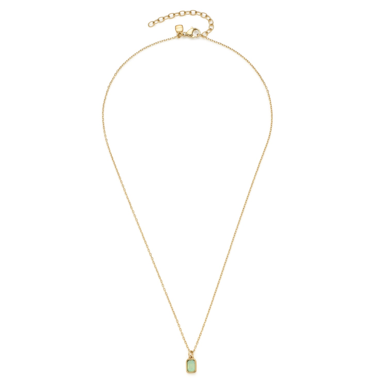 An diesem Schmuckstück ist alles zart. Das feine, diamantierte Ankerkettchen mit seinem Karabinerverschluss und der Verlängerung, sowie auch der kleine, rechteckige Anhänger, der aus einem facettierten, mintgrünen, opaquen Glaskristall besteht und in einer zarten Edelstahl-Fassung gehalten ist.