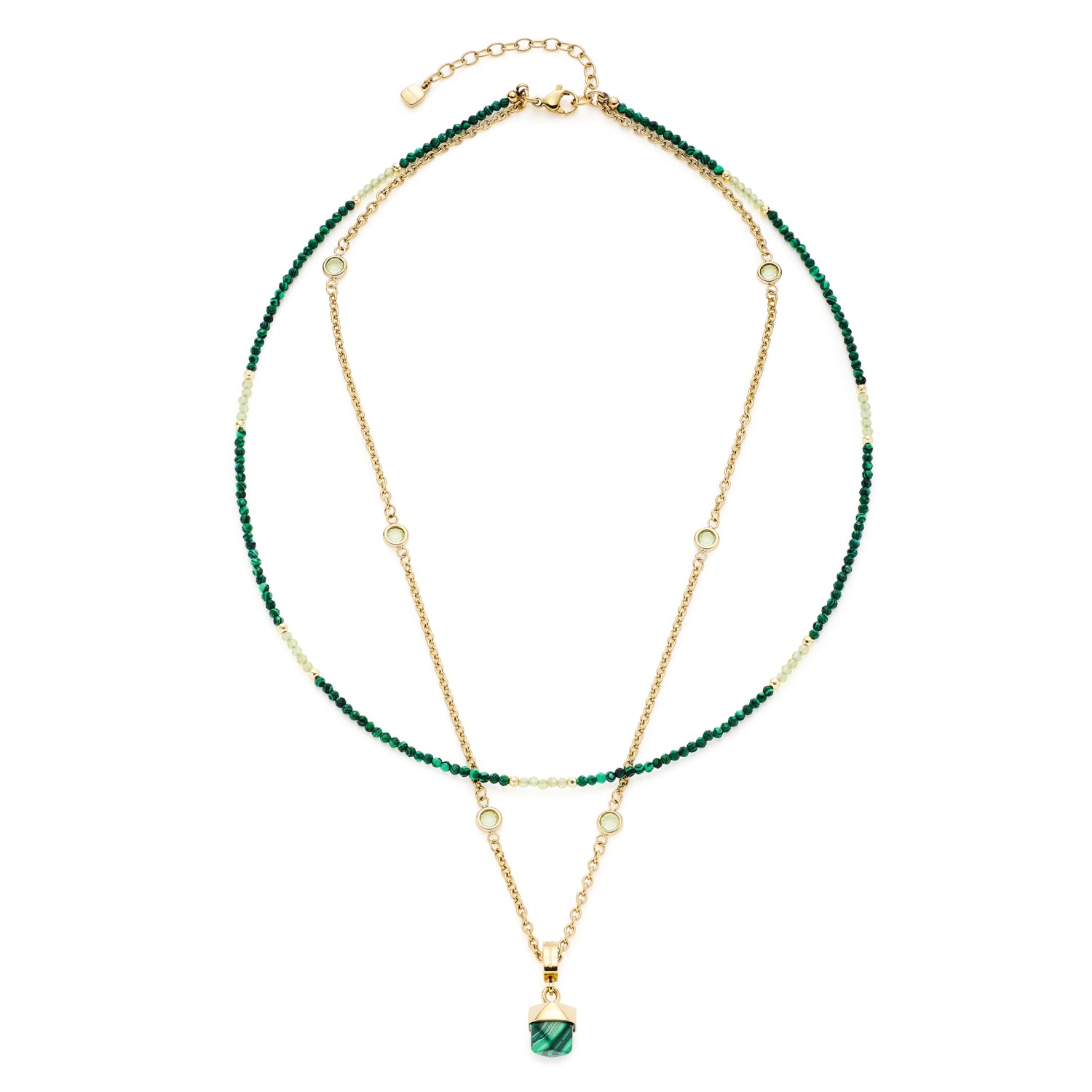 Der Malachit steht für inneren Frieden. Kein Wunder, denn schon seine Farbgebung wirkt beruhigend und kreiert ein Gefühl von Zufriedenheit. Bei dieser kurzen Halskette schlägt das Herz aufgrund der bezaubernden Optik allerdings erst einmal schneller, bevor es sich dank der heilsamen Kräfte des Malachits wieder beruhigt. Zu den natürlichen Malachitperlen ist die Doppelstrangkette noch mit facettierten, lindgrünen Glassteinen in einer feinen goldenen Ankerkette und einem synthetischen Malachit-Anhänger mit eckig ausgeformter Edelstahlkappe verziert.