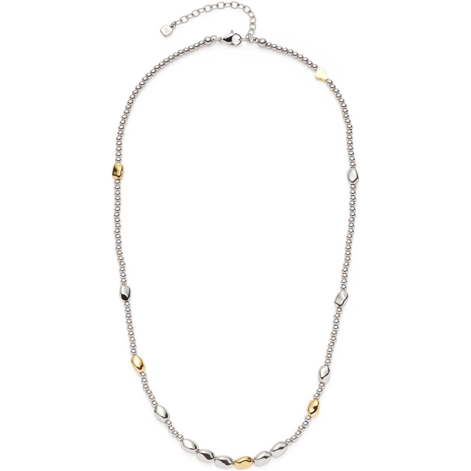 Die Halskette VEJA begeistert mit ihrer feinen Interpretation des Two Tone Trends. Polierte Metallkugeln in Silber werden unregelmäßig von kleinen Nuggets in Silber und Gold durchbrochen, was der Kette eine elegante, aber zurückhaltende Bicolor-Optik verleiht. Ein besonderes Detail setzt eine kleine, goldfarbene Schmuckplakette im Nackenbereich. Die kurze Kette lässt sich dank Karabinerverschluss und Verlängerungskette flexibel anpassen ? perfekt für moderne Looks, die dezente Eleganz und Vielseitigkeit vereinen.