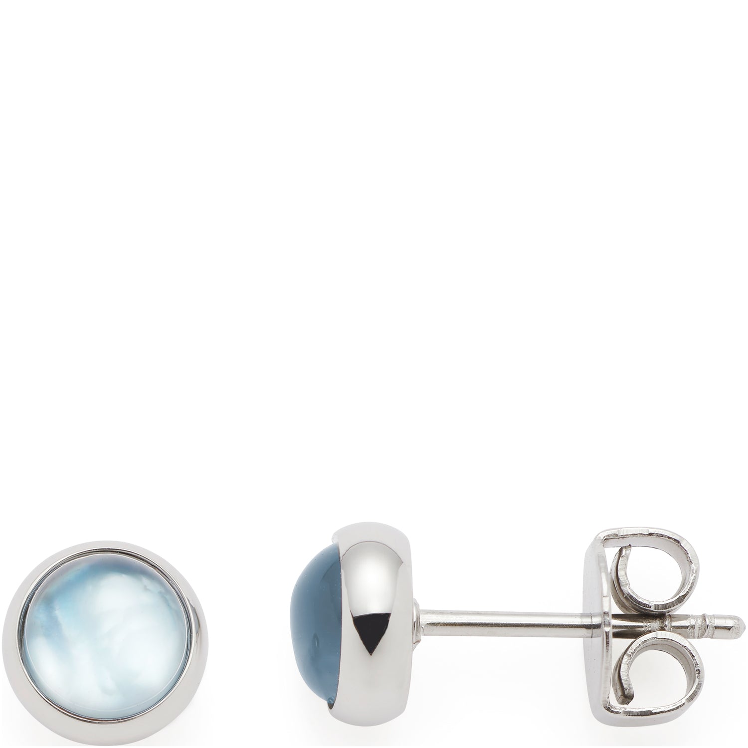 Mit den mittelgroßen Ohrsteckern wird die Halskette Bea stilvoll ergänzt. Ihr weich ausgeformter Stecker wird auch hier von einem Cabochon aus blauem Glas mit Perlmutt verziert. Sie sind elegant und dennoch so dezent, dass sie sich mit unterschiedlichen Stilen kombinieren lassen. Dank ihres minimalistischen Designs eignen sie sich auch für die Kombination mit anderem Ohrschmuck zum trendigen Stacking.