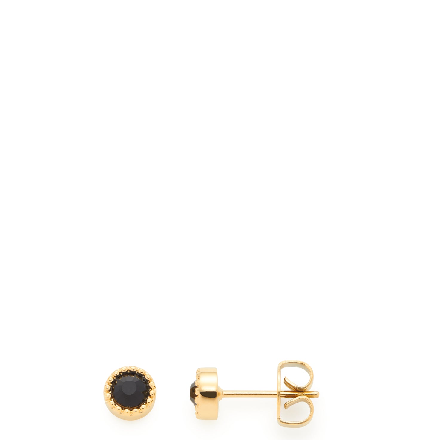 Schwarze Glaskristalle mit funkelndem Facettenschliff sind bei diesen kleinen Ohrsteckern von fein ziselierten Fassungen umgeben. Das Design wirkt durch die goldene Ionenplattierung des Edelstahls warm und elegant.