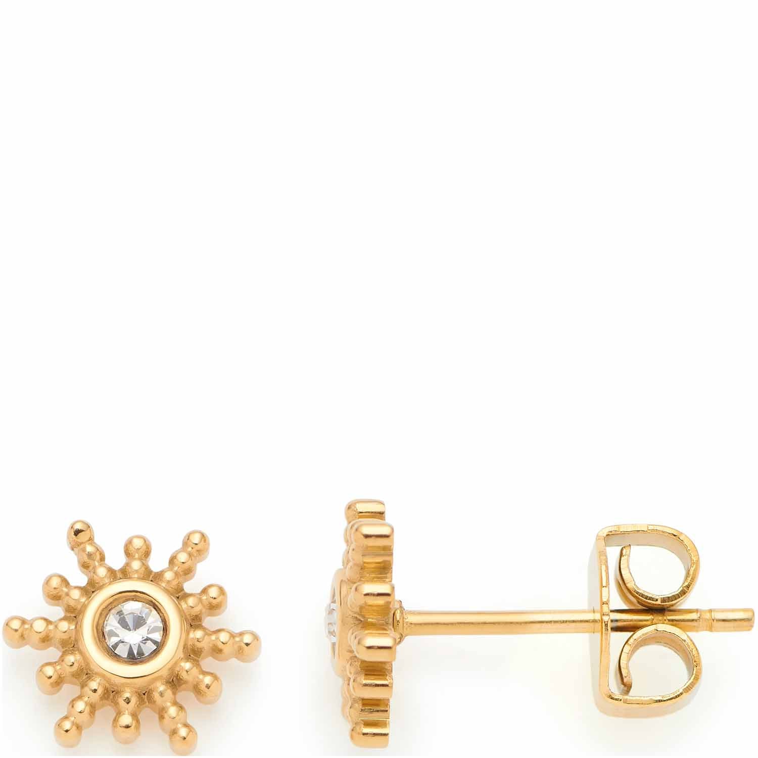 Zierliche Ohrstecker mit einem bezaubernden Sonnen-Motiv: Die Sonnenstrahlen sind kunstvoll aus winzigen, zusammengesetzten Kügelchen gestaltet. In der Mitte des Motivs ist ein funkelnder, klar facettierter Glaskristall eingelassen, der das Licht einfängt und funkelnd bricht. Die kleinen Ohrstecker sind ein charmantes Accessoire und perfekt, um jedem Look einen Hauch von Sonnenschein und Glanz zu verleihen.