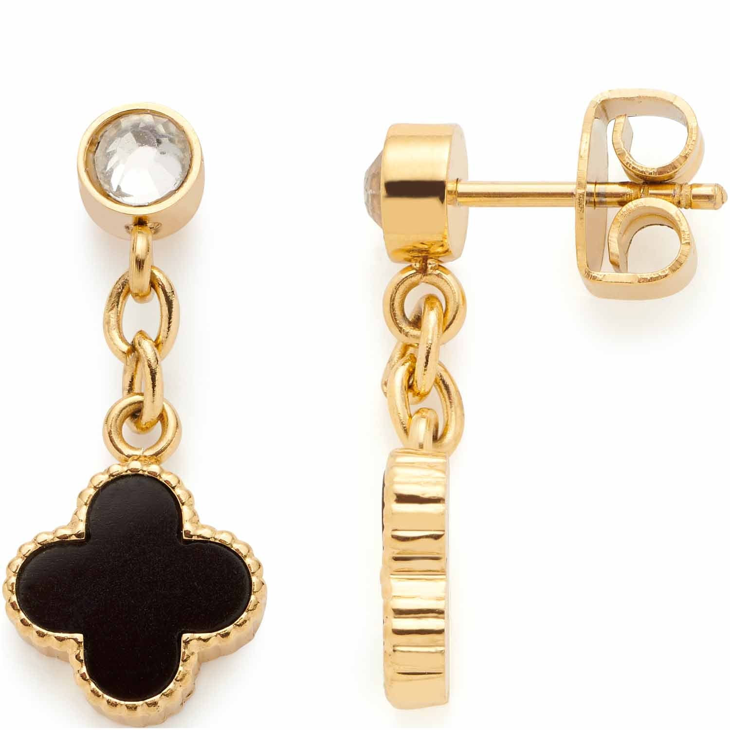 Gleich doppelt so viel Glück muss dieses Paar Ohrringe verheißen, denn es lassen sich hier direkt zwei Kleeblatt-Anhänger in stilisierter Form entdecken. Es heißt nur ein Kleeblatt unter 1000 besitzt die gefragten vier Blätter, warum es ohne Umschweife zum Glückskleeblatt auserkoren ist. Ob diese Ohrstecker nun Glück bringen oder vielleicht auch nicht, Freude schenken sie mit ihrem schwarzen Glasstein, dem fein ziselierten Rand und den facettierten Glaskristallen auf jeden Fall.