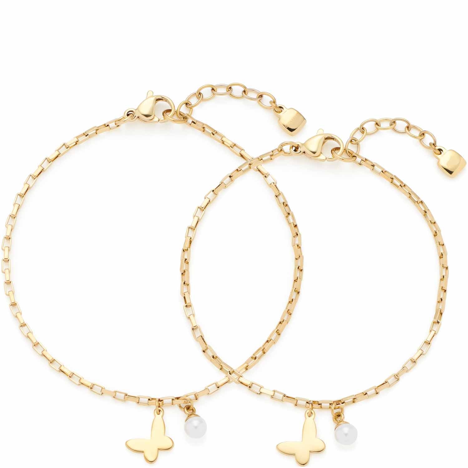 Um die besondere Verbindung von Mutter und Tochter zu zelebrieren, eignet sich dieses Armband-Set perfekt. Beide Armbänder bestehen aus einer weiten Anker-Vierkant-Kette. In diese sind jeweils zwei kleine Charms eingehangen. Ein kleiner, abstrahierter und flächiger Schmetterling und eine zarte Imitationsperle mit Edelstahlkappe. Geschlossen werden die Schmuckstücke mit einem klassischen Karabinerverschluss.