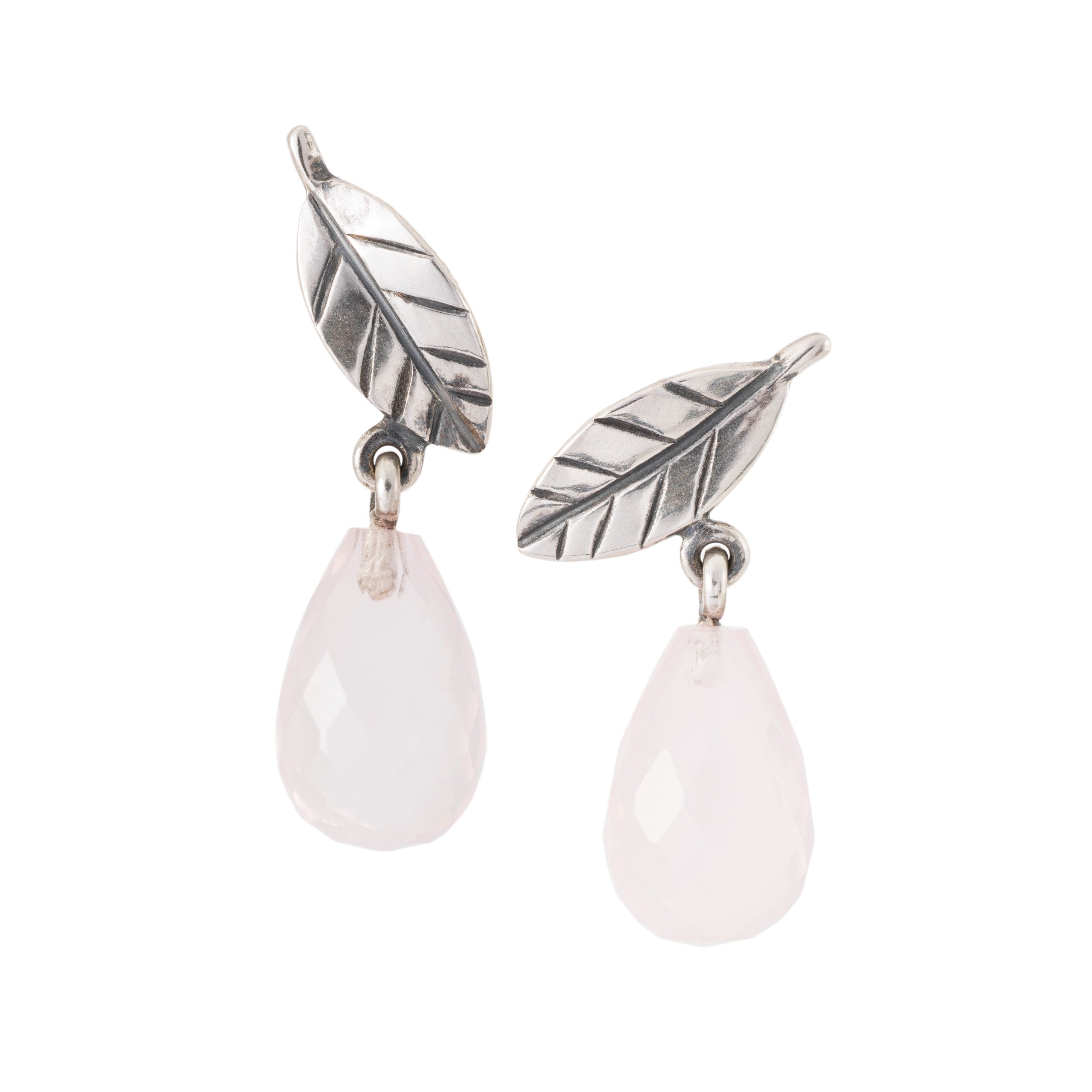 An einem perfekten kleinen Blatt hängt ein Tropfen aus facettiertem Rosenquarz. Die Ohrringe sind leicht unterschiedlich gestaltet und ergeben einen wunderbaren, asymmetrischen Look.