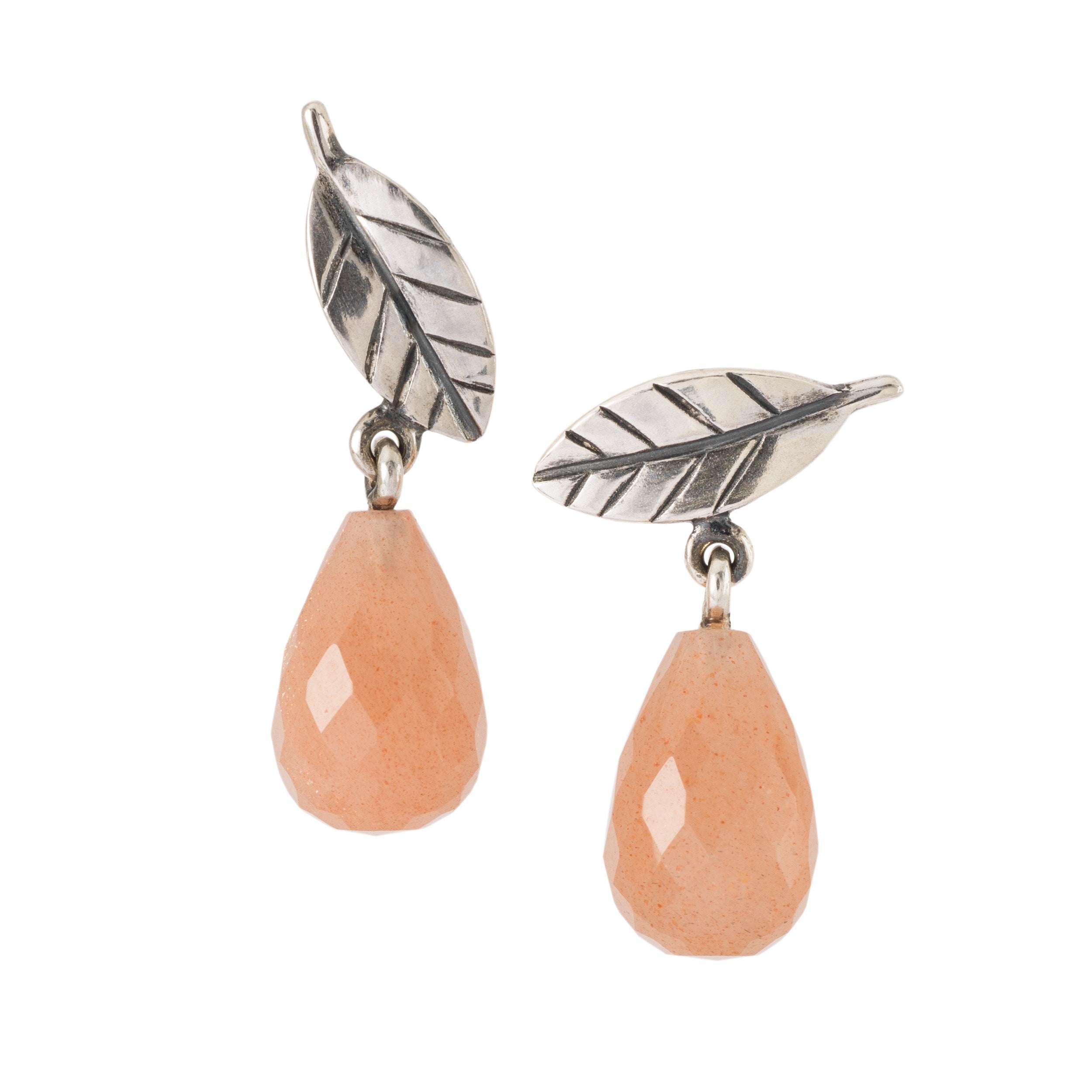 An einem perfekten kleinen Blatt hängt ein Tropfen aus facettiertem Feldspat Mondstein. Die Ohrringe sind leicht unterschiedlich gestaltet und ergeben einen wunderbaren, asymmetrischen Look.