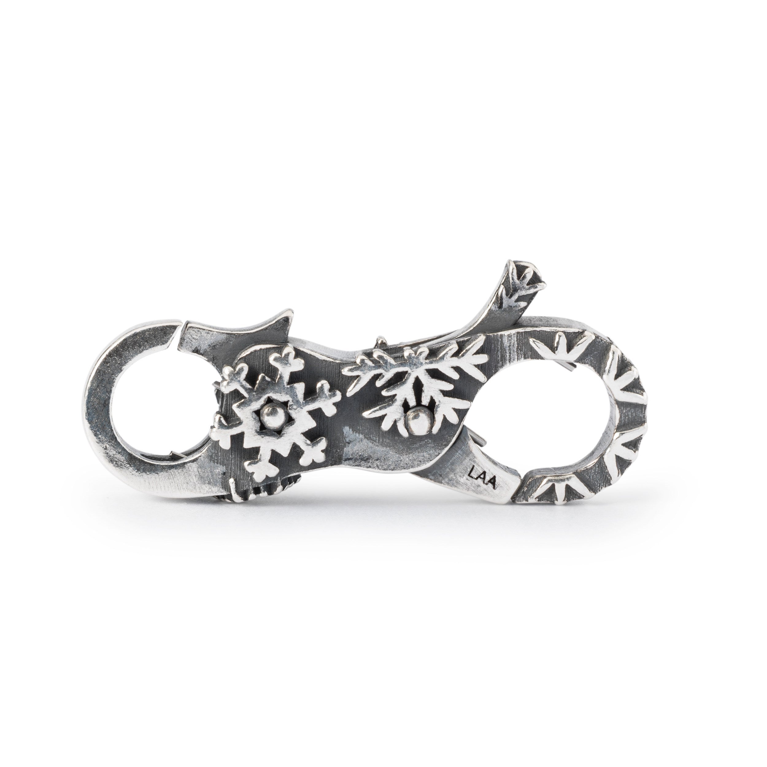 Der Schneeflöckchen Verschluss ist mit fein detaillierten Schneeflocken versehen, die sich so federleicht anfühlen, dass sie sich fast vom Silber abheben.