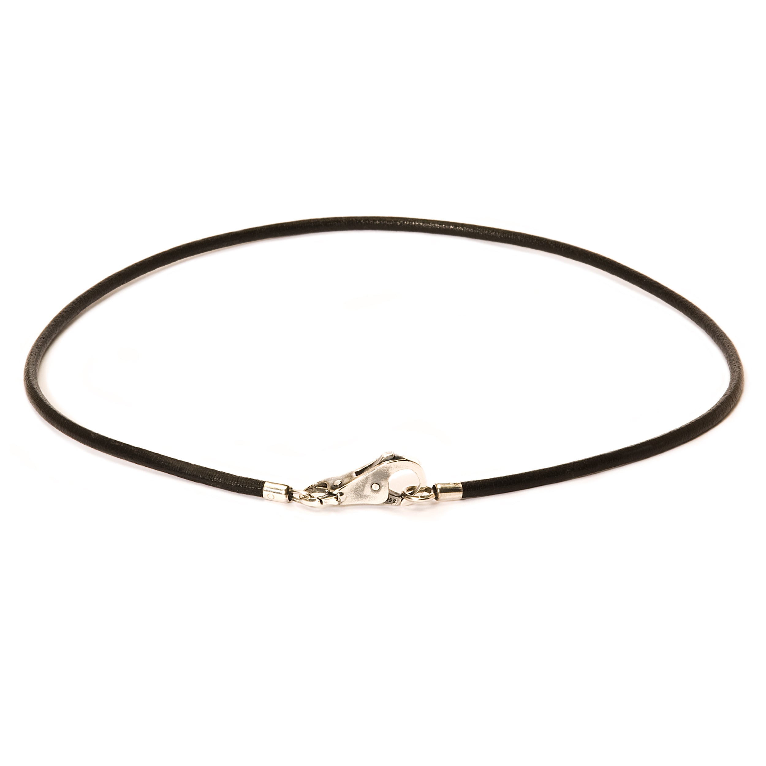 Eine geschmeidige schwarze Halskette, handgefertigt aus einem Lederstreifen.