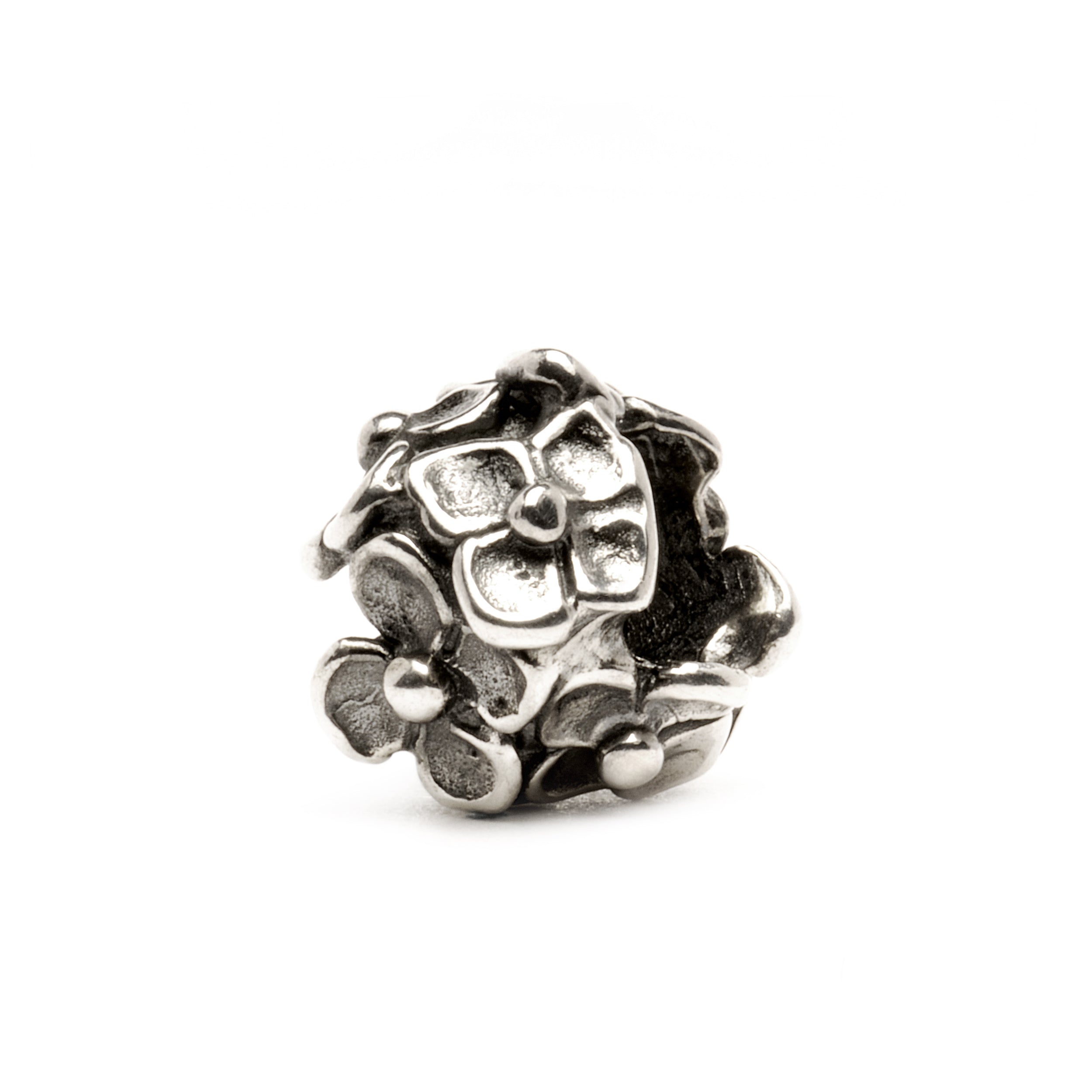 Winzige Hortensienblüten bedecken die Oberfläche dieses silbernen Trollbeads, so wie sie es auch in der Natur tun.