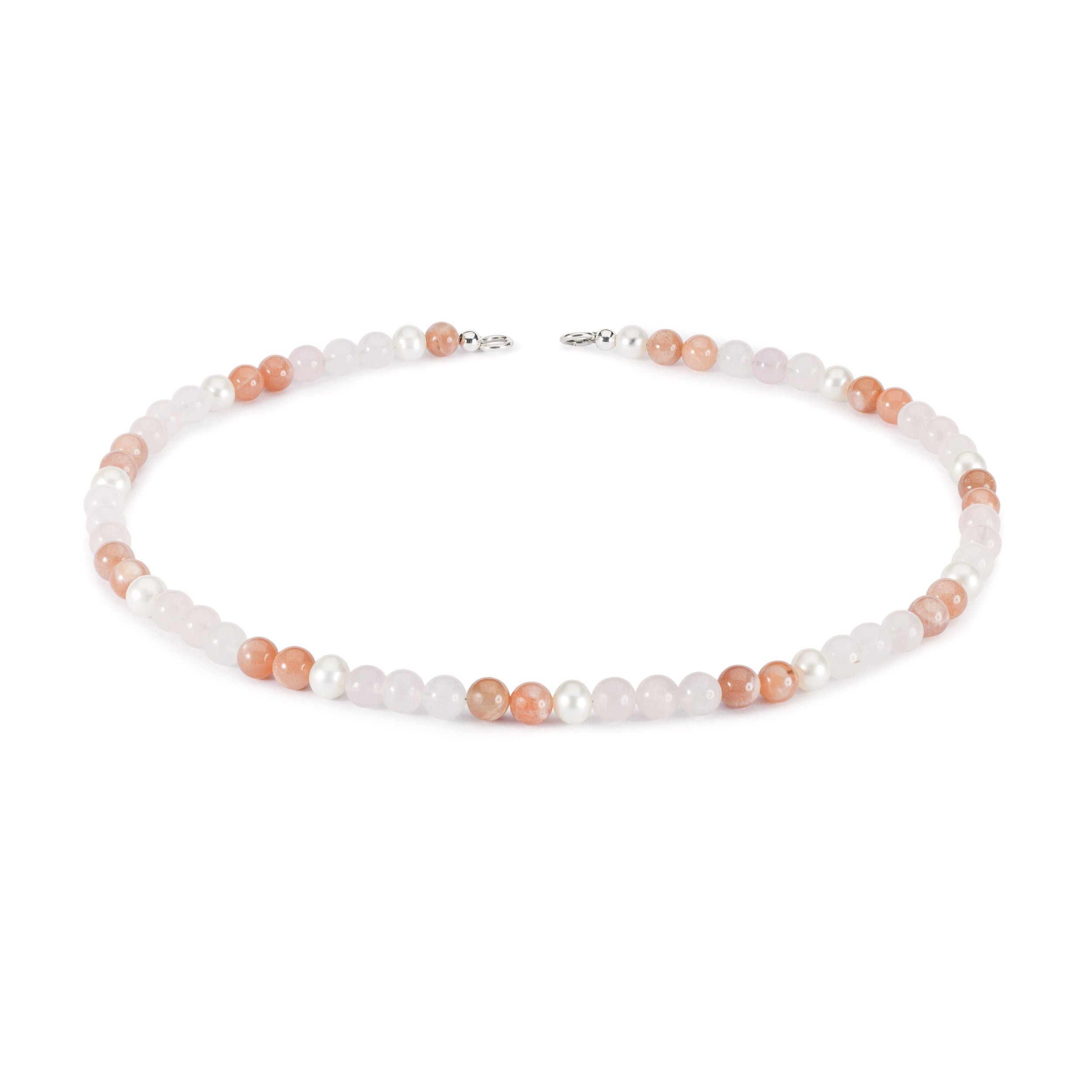 Handgefertigte Edelstein-Halskette mit Rosenquarz, Mondstein und Süßwasserperlen. Eine Halskette, die dein Herz für die Liebe öffnet...